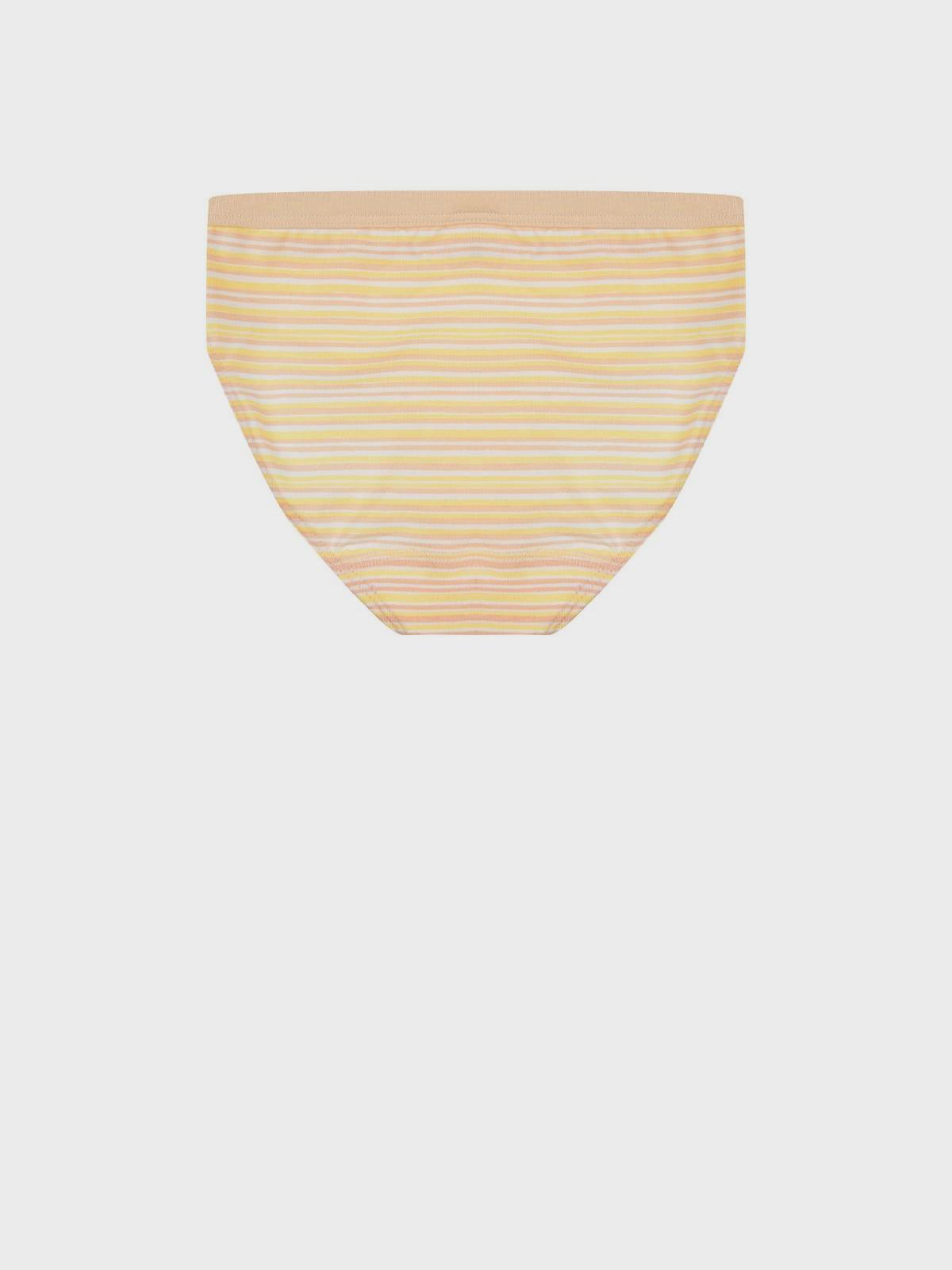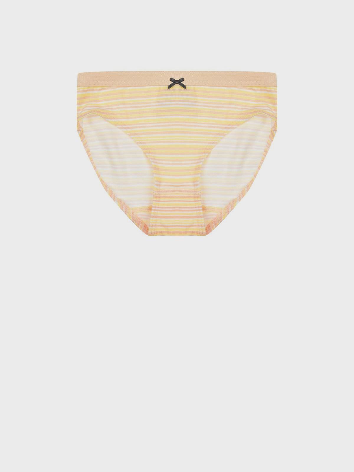Желтые трусы из органического хлопка с принтом в полоску. Ткань отличается мягкостью и хорошей воздухопроницаемостью. Классическая модель выполнена с высокой посадкой. Эластичный пояс с миниатюрным бантиком создает комфортное прилегание к талии.