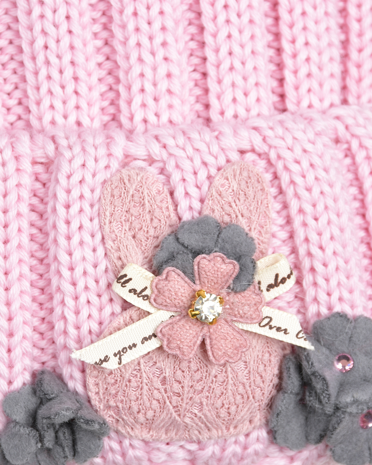 Розовая шапка с меховым помпоном и аппликацией "заяц"