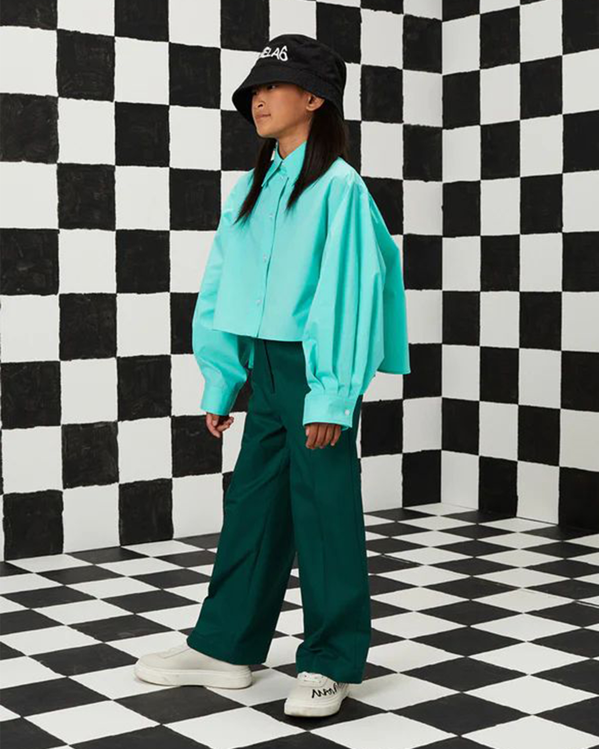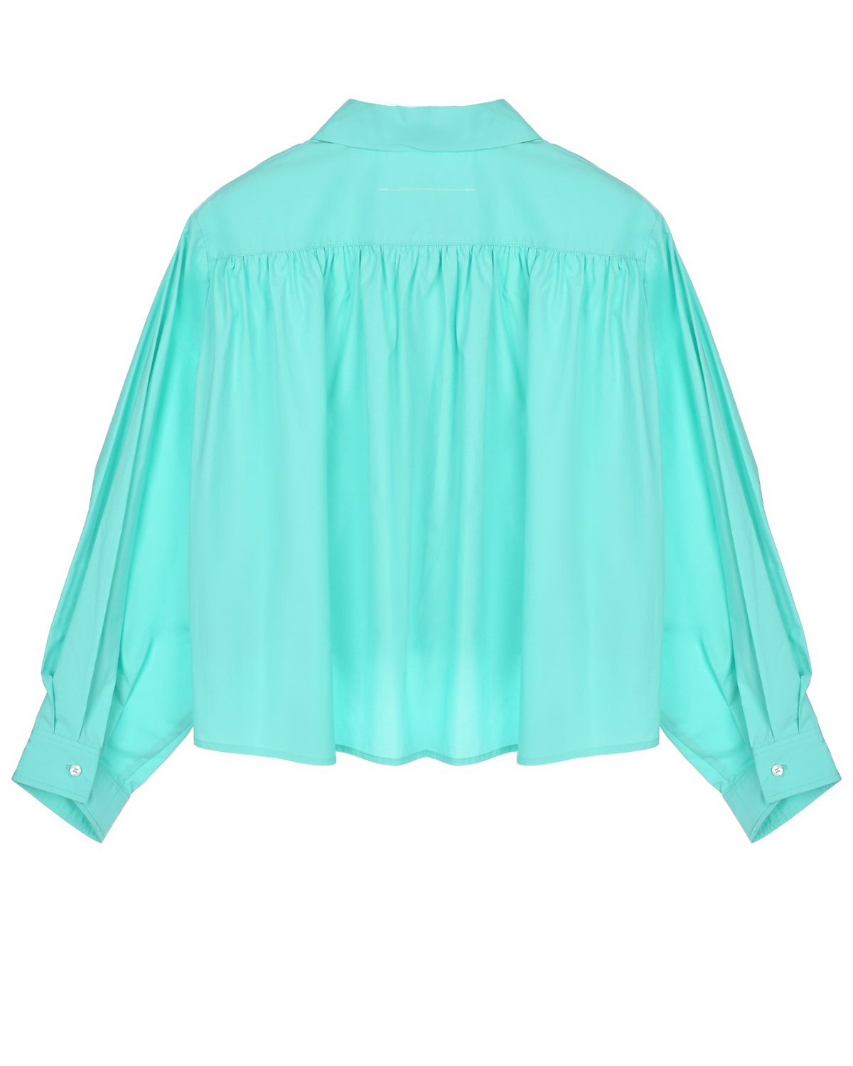 Рубашка мятного цвета сшита из натурального хлопка. Легкий материал и свободный крой способствуют хорошей циркуляции воздуха. Укороченная модель с отложным воротником и длинными рукавами застегивается на пуговицы. Спинка выполнена с верхним удлиненным слоем со сборкой. На подоле вышито лого в тон.