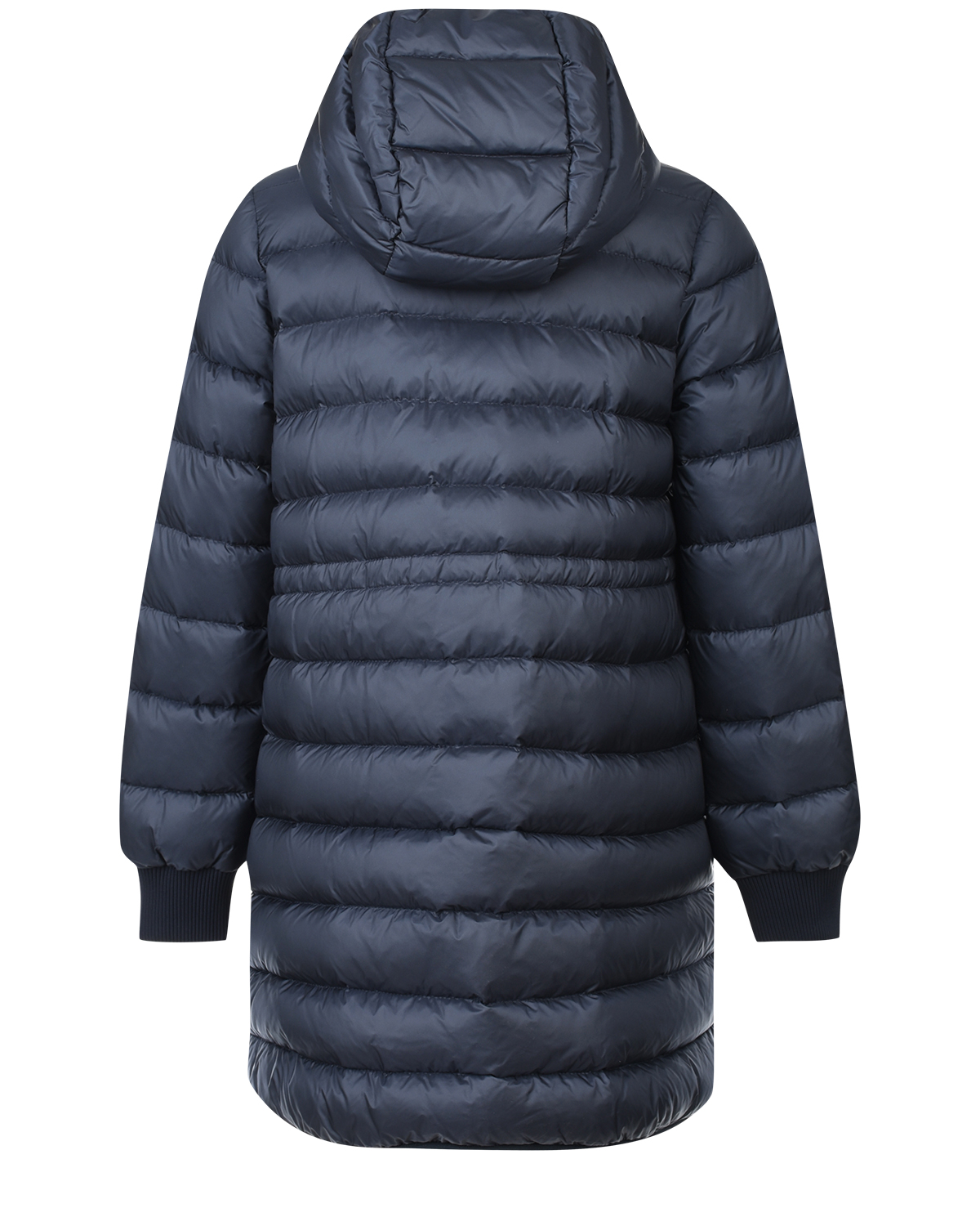 Синее пуховое пальто с боковыми разрезами
