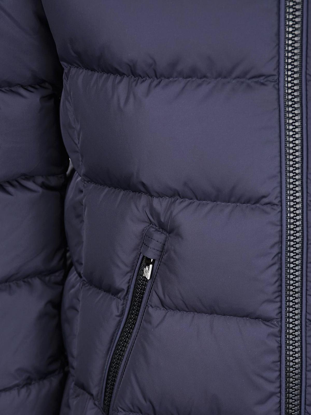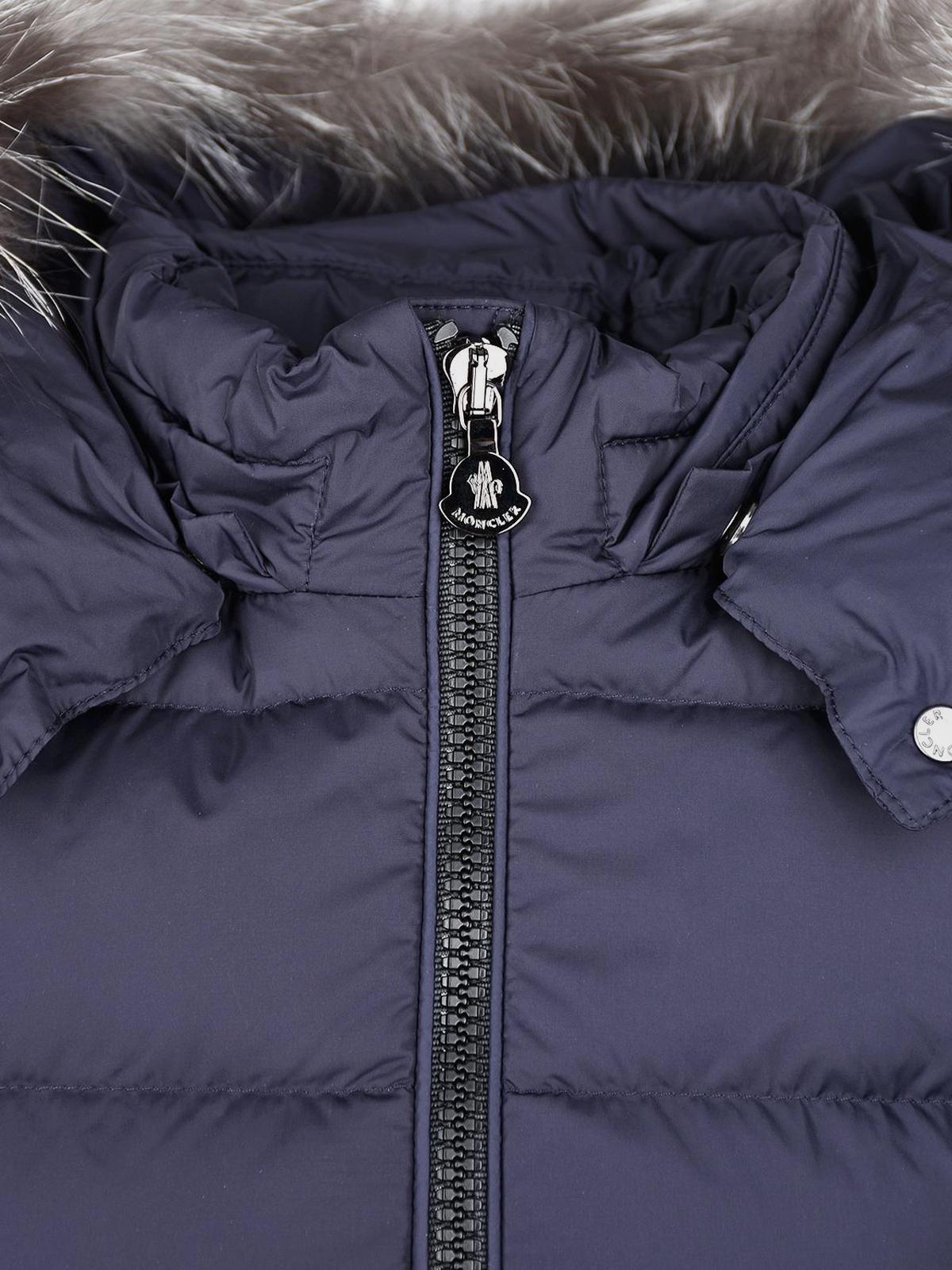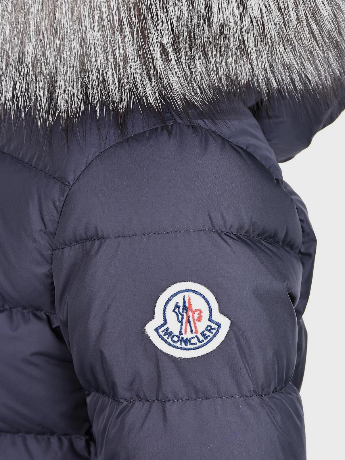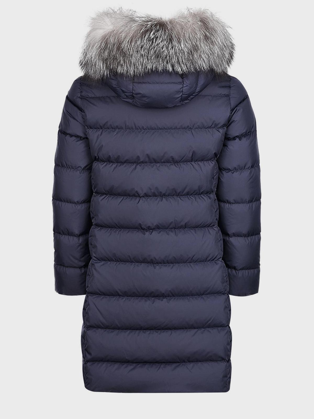 Темно-синее пальто-пуховик с меховой отделкой