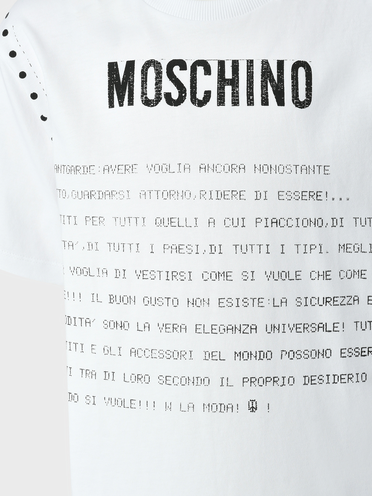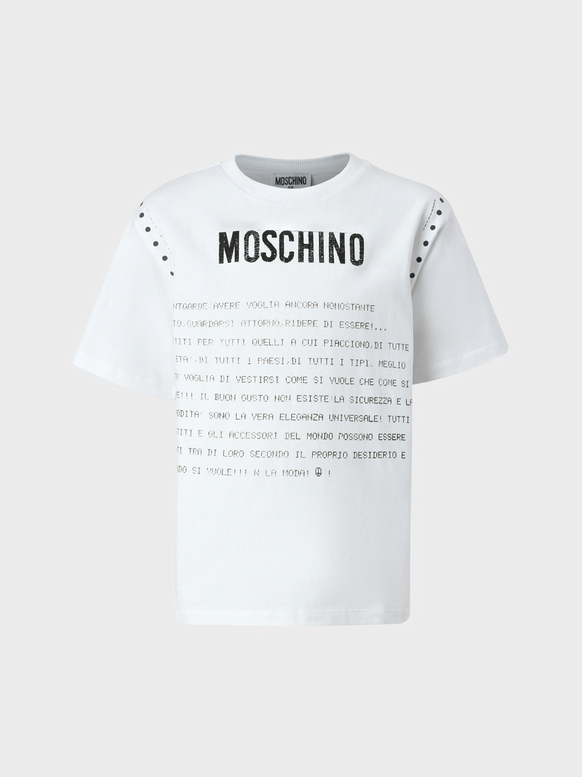 Moschino – уникальный случай, когда насмешка и пренебрежение серьезным отношением к моде от создателя бренда Франко Москино стали залогом бешеной популярности. Дерзкий, яркий, местами эксцентричный бренд Moschino с его ироничной интерпретацией классики без ущерба для элегантности сумел завоевать многолетнюю любовь публики. В октябре 2008 года Moschino начали создавать детские коллекции: Moschino Teen – для детей от 6 до 14 лет, Moschino Kid – от года до 6 лет и Moschino Baby – от рождения до 2 лет, сохраняя свой узнаваемый ироничный стиль.