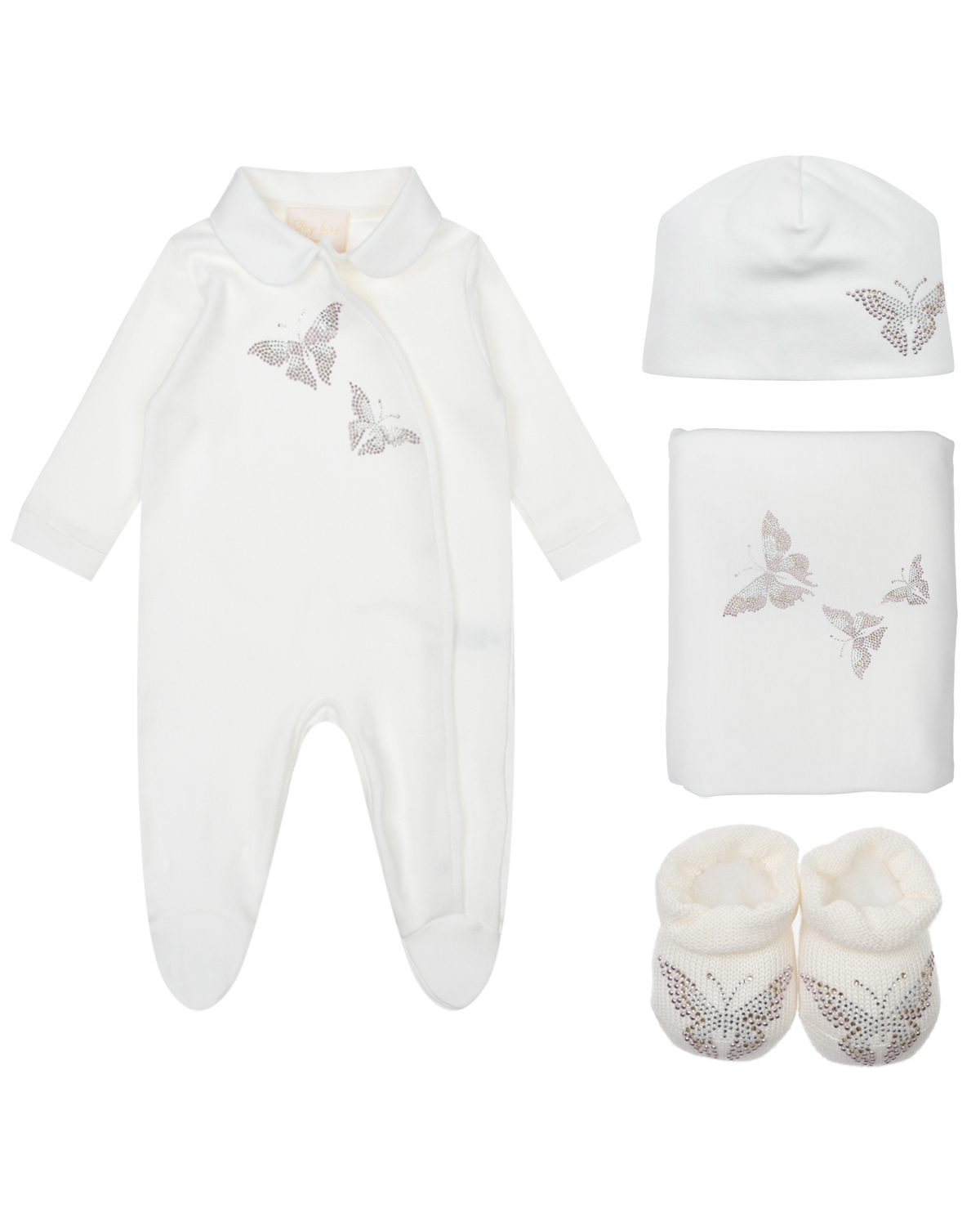 Подарочный набор с бабочками из стразов: комбинезон, шапка, оедяло, пинетки