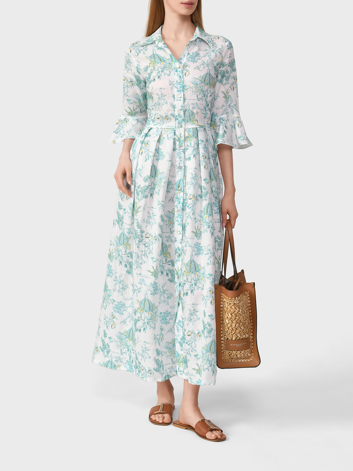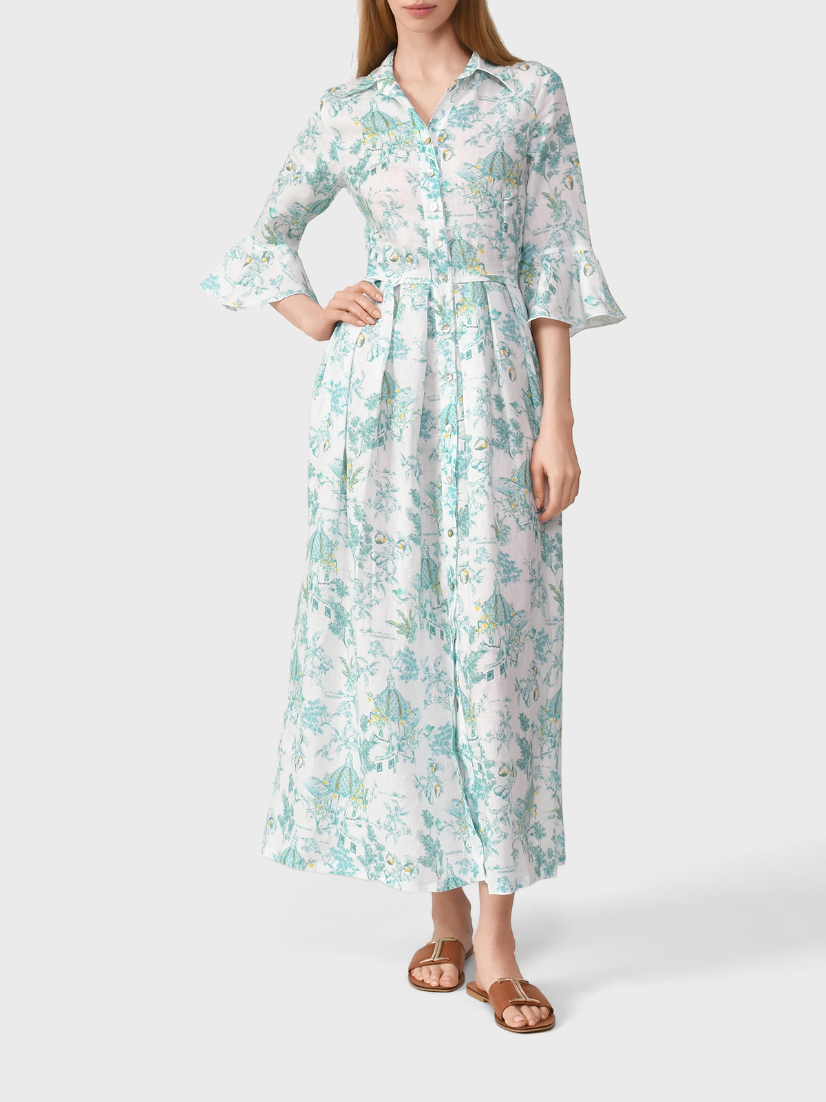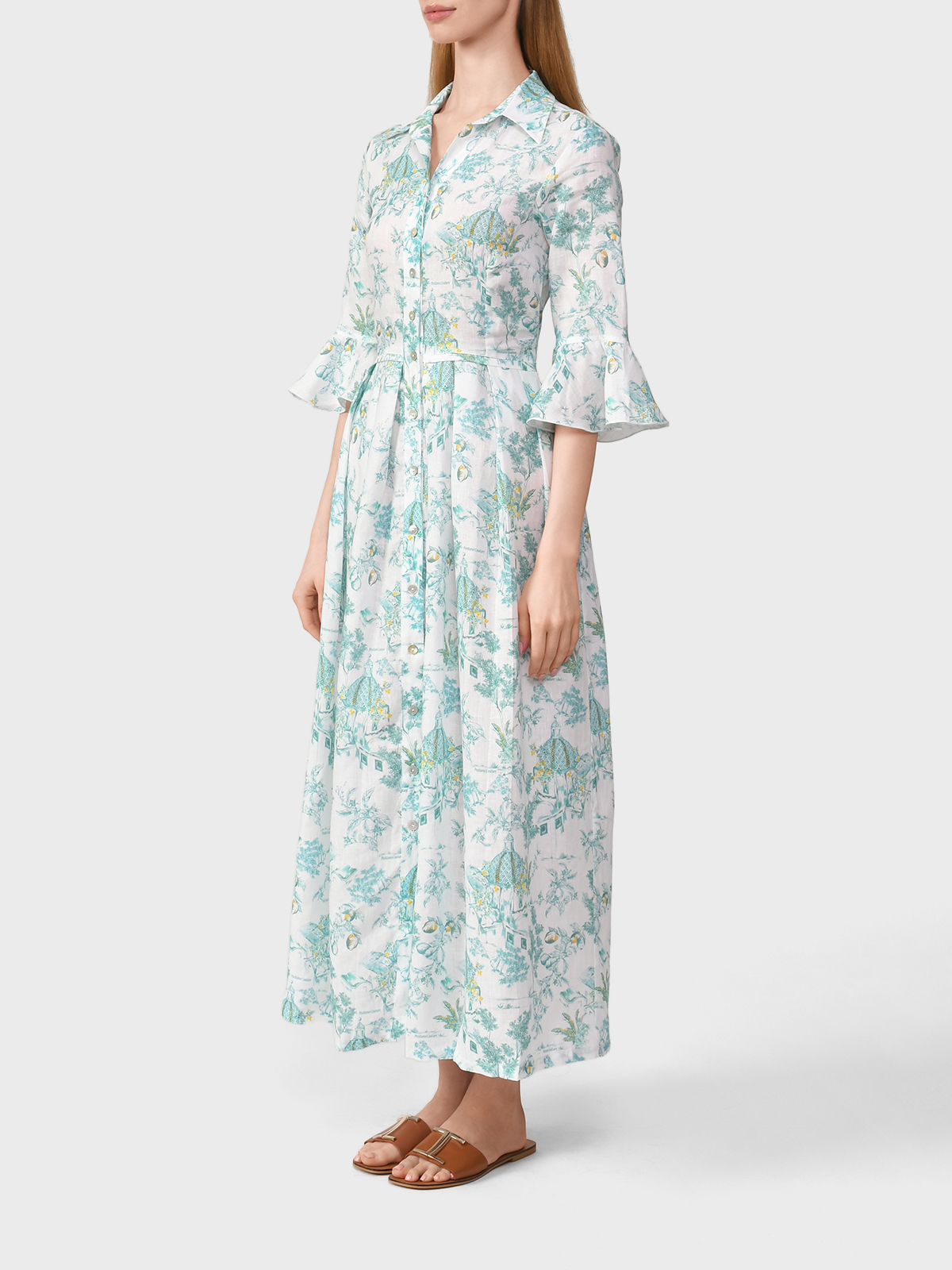 Льняное платье с воланами на рукавах